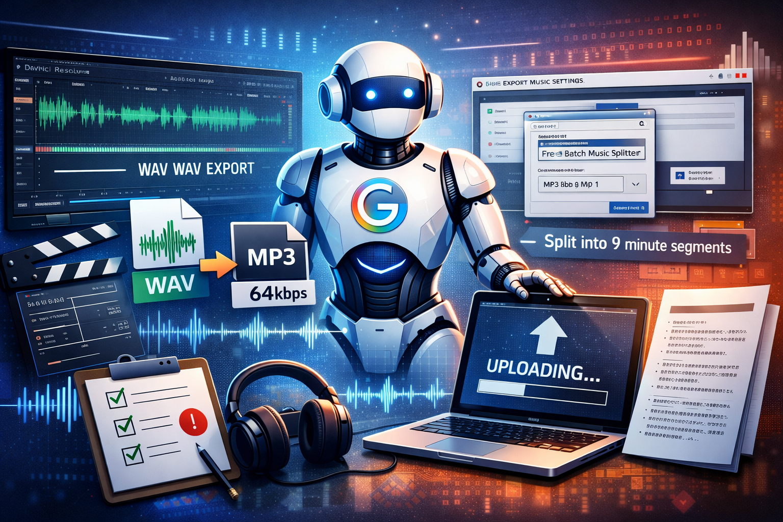 DaVinci ResolveでWAV抽出→Audacityでモノラルmp3化→9分分割→冒頭検証付きでGemini投入,この形にすると,効率的に文字起こしが実現できる。